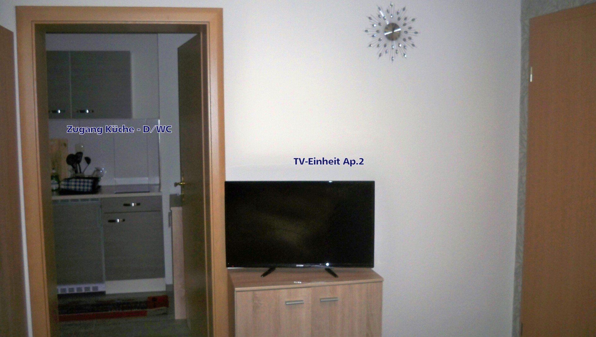 Sitzecke Tisch mit 2 Stühlen und Schlafsofa,Sat-TV ; Küche 4,60 qmtr. mit Kühlschrank,